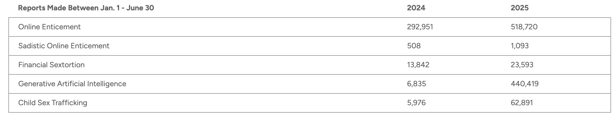 The National Center for Missing & Exploited Children (NCMEC) has seen sharp increases in new and evolving crimes targeting children gleaned from reports to their CyberTipline, which serves as the national reporting mechanism for online child sexual exploitation: